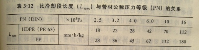在此假設(shè)條件下,Lspec僅與PPH管道標(biāo)準(zhǔn)尺寸比(壓力等級(jí))有關(guān),而與管材的直徑及絕對(duì)壁厚值無(wú)關(guān)。表3-12為比冷卻段長(zhǎng)度(L spec)與管材公稱壓力等級(jí)(PN)的關(guān)系。