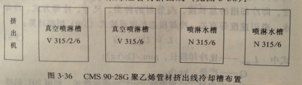為減少PPH管材內(nèi)應(yīng)力,推薦采用間隔冷卻方式,即冷卻槽間留有一定距離。冷卻槽間,管壁內(nèi)部的熱量向外擴(kuò)散,管壁外層升溫而內(nèi)層相應(yīng)降溫。通過(guò)此方式,可顯著降低內(nèi)應(yīng)力的產(chǎn)生。對(duì)PPH管道,間隔冷卻尤其重要;對(duì)外徑大于110mm的PE管,也是必要的,而且外徑愈大,愈必要。較大的HDPE管材,應(yīng)有2-3個(gè)這樣的間歇冷卻段。因而總的冷卻長(zhǎng)度Lges,[見(jiàn)式(3-10)]